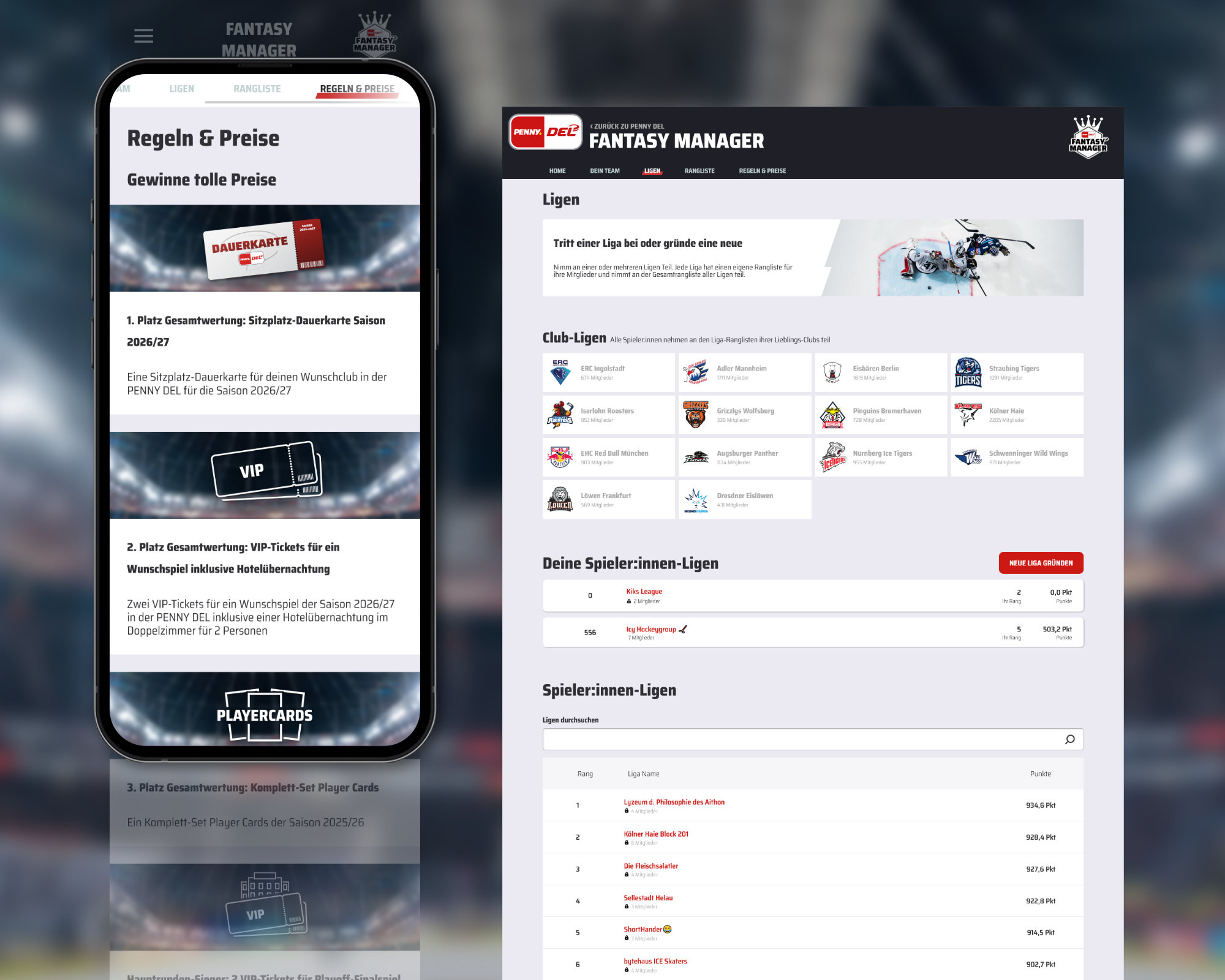 The Penny DEL Fantasy Manager accompanies the 2025/26 ice hockey season. Prove yourself as a manager and create your own team to climb the rankings. All users have the same puck budget available, so this is where your expertise really counts. Players are rated after each match day and you receive points based on their performance. The best players can win great prizes, such as a season ticket for your favorite club for the entire 2026/27 season!
